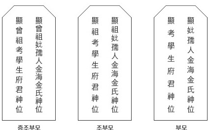 - 직위: 벼슬이 없으면 남자는 "학생(學生)", 여자는 "유인(孺人)"이라고 씁니다.