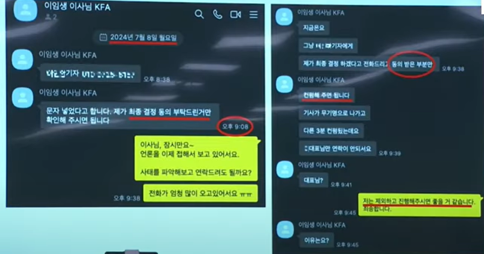 의원의 날카로운 추궁에 이 이사는 울먹이며 자신의 억울함을 호소했다. 그는 “내가 (감독을) 결정하게끔 부탁을 드려서 동의를 다섯 분으로부터 다 받았다”고 주장했지만, 의원이 제시한 카카오톡 대화 내용은 그의 주장을 정면으로 반박했다.