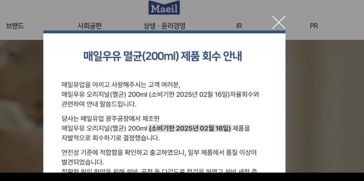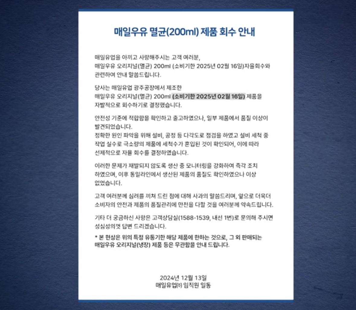 매일유업은 일부 '매일우유 오리지널(멸균) 200㎖' 제품에서 세척수가 혼입된 사실을 확인하고, 해당 제품을 자발적으로 회수하기로 결정했습니다.